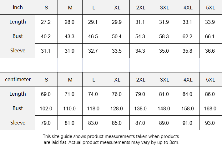 | centimeter | S | M | L | XL | 2XL | 3XL | 4XL | 5XL |