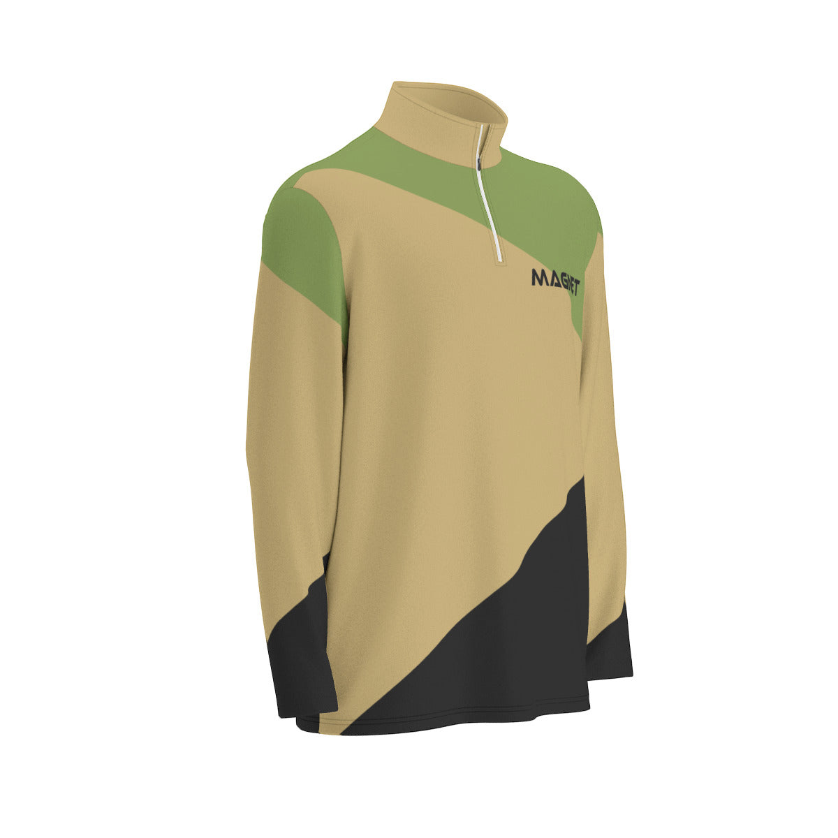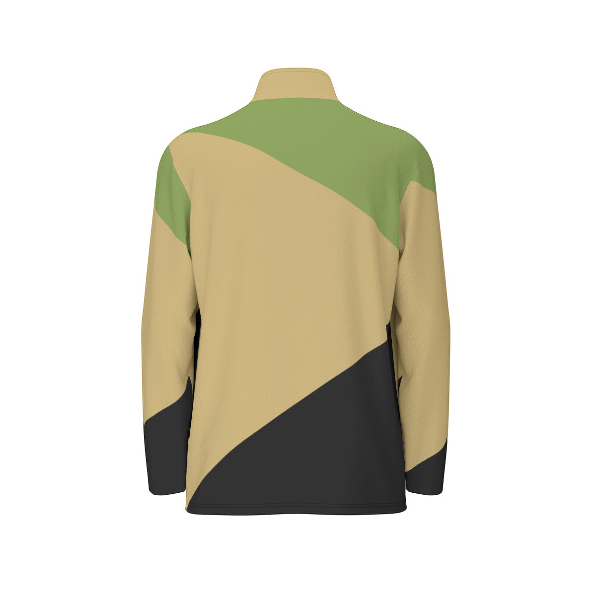 - Stand-up collar, half-open front zipper