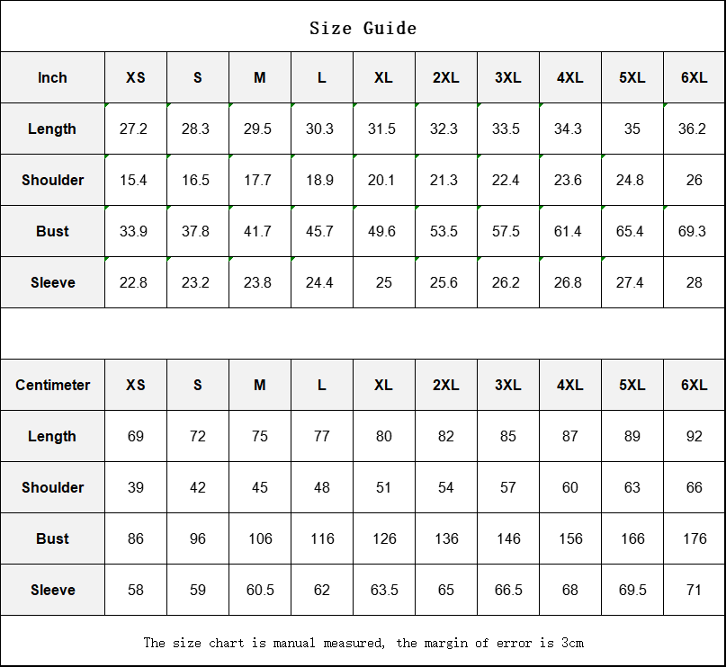 The size chart is manual measured, the margin of error is 3cm